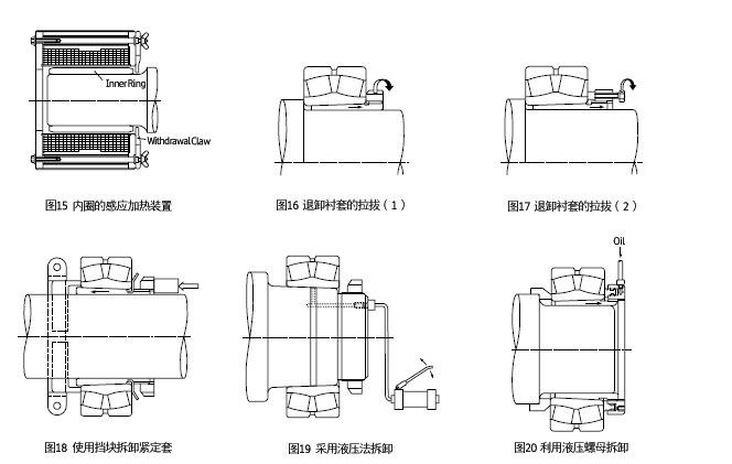 大型轴承,利用液压拆卸更加容易,如图19。在锥孔轴上的油孔中加压送油,使内圈膨胀,拆卸轴承。操作中防止轴承突然脱落,也可使用液压螺母拆卸衬套。图20是利用液压螺母拆卸衬套的方法。
